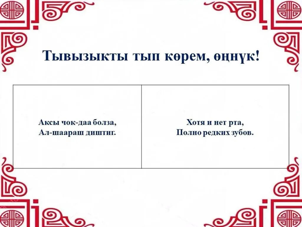 Неделяның бирги хүнүнде “Тывызыкты тып көрем, өңнүк!” деп рубрикавысты бараалгаттывыс.
